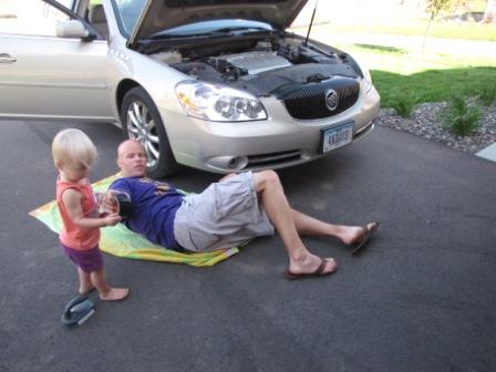 Prior to my departure, I had to take a spin down pit row to have my "crew" tape up a little cosmetic damage to my front right bumper that had got caught up on one of those cement parking lot wheel stoppers. I had expert help!
